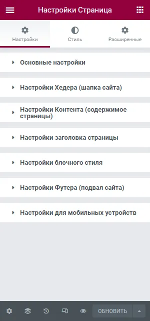 При редактировании страницы нажмите на значок шестерёнки в левом нижнем углу экрана, и Вы получите доступ к настройкам этой страницы.